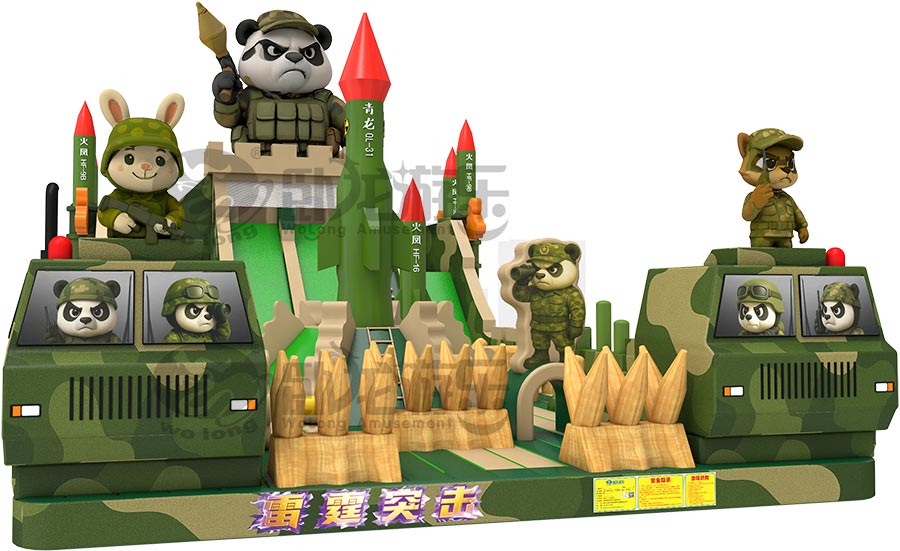 Approaching this inflatable castle, one is first attracted by its strong military style. The calm camouflage color is the main tone, resembling a miniature "military base" and instantly igniting children's sense of exploration. The design inside the castle holds more surprises. The cute panda shape is no longer gentle; instead, it is "fully armed", as if guarding an important area of the base. The cute rabbit has also transformed into a "scout", squatting in the corner of the castle, seemingly observing the surrounding movements. What catches people's eyes is the majestic armored vehicle shape. The body lines are tough, the details are exquisitely depicted, and elements such as wheels and artillery are all available. When children play inside, they can imagine themselves driving armored vehicles to carry out missions and always be ready to meet challenges.