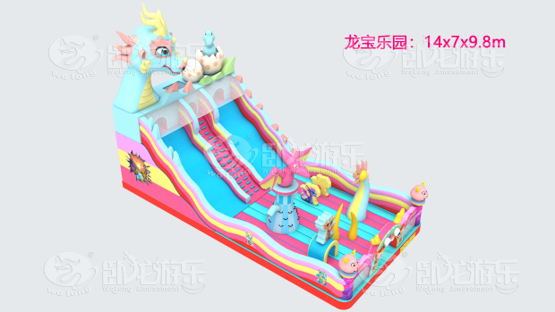 The dragon-themed inflatable castle is a perfect example of this charm. Adorned with playful dragon-themed characters, it boasts a rainbow of hues: soft turquoise, bubblegum pink, sunny yellow, and bold red. At the entrance, a friendly, large-scale dragon figure greets kids, while smaller dragon statues and a tiny winged dragon add to the fairy-tale vibe. The structure itself is a maze of fun: twisty slides that glide into padded landing areas, bumpy climbing walls that challenge little adventurers, and arched doorways that lead to hidden nooks for hide-and-seek. Every corner is designed to spark imagination—kids might pretend to be dragon tamers exploring a magical fortress, or pirates hunting for treasure in a colorful stronghold.
