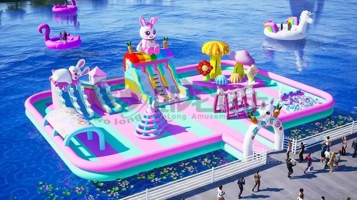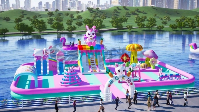 Tired of water parks that leave you soaked or seasonal spots that close when the weather turns? Bunny Floating Paradise is your answer. This 30×20m inflatable wonderland floats on water but keeps you completely dry, connected to shore by a stable walkway.
