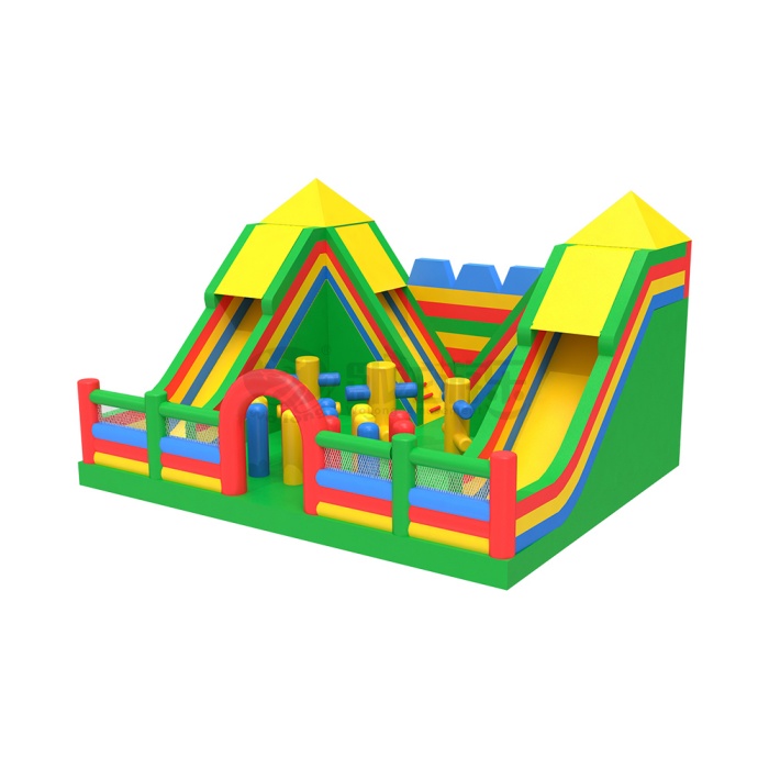 Crafted from CE-certified, thickened eco-friendly PVC, this inflatable combo excels in both heat and cold resistance, making it suitable for tropical beaches and Nordic shopping malls alike. Its classic dual-slide + obstacle course design caters to children aged 3–12: the left wave slide delivers an adrenaline-pumping rush, while the right straight slide is perfect for younger explorers. The central area features inflatable climbing pillars, a rainbow arch, and soft obstacles, helping kids develop coordination and social skills through interactive play. The vibrant rainbow color scheme creates instant visual appeal, ensuring it becomes an immediate crowd-puller at any venue.